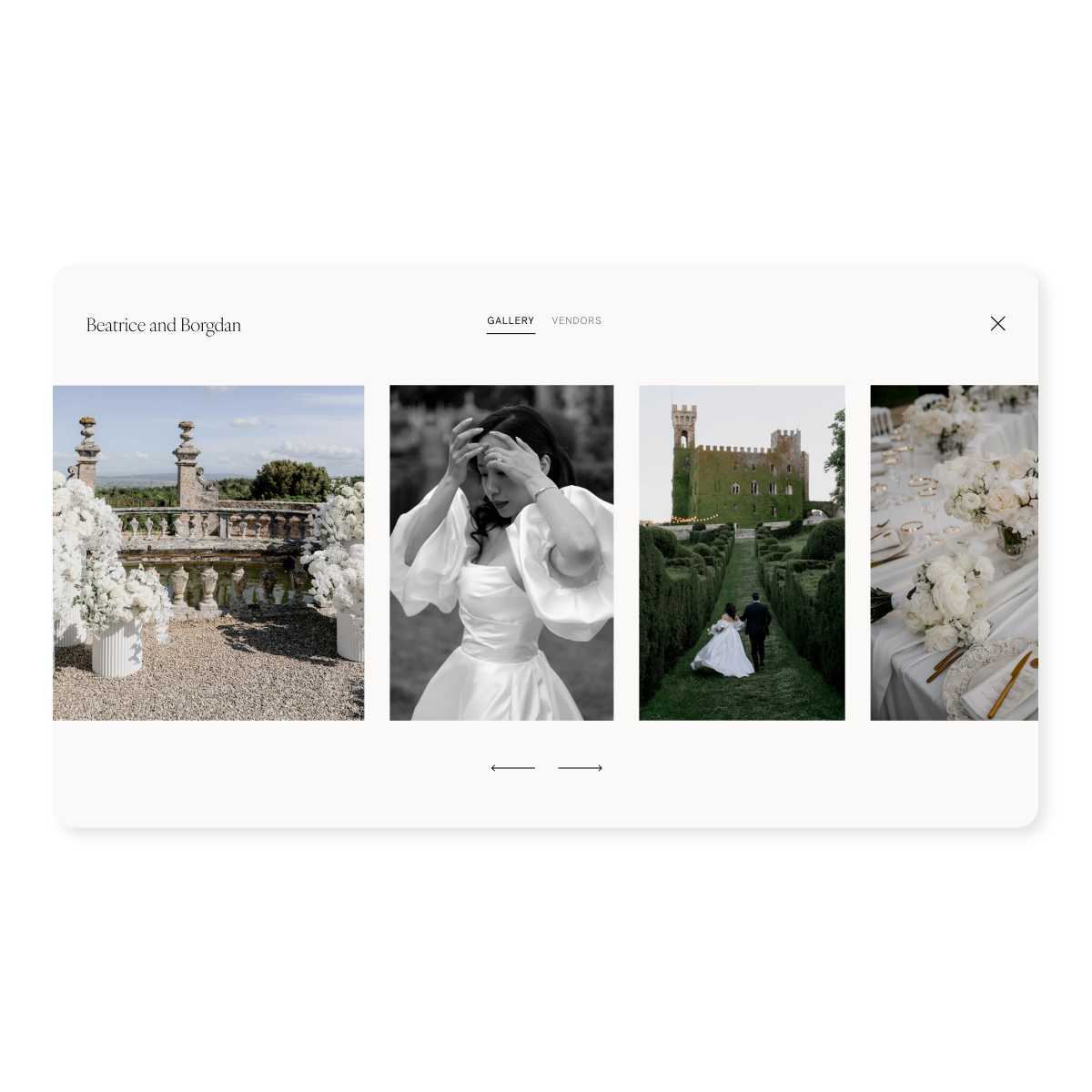 An Album allows you to showcase your work within the full context of the wedding story — helping couples understand your role and aesthetic as part of the larger celebration. It’s one of the simplest ways to highlight recent work and keep your profile fresh.